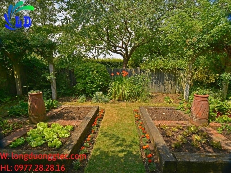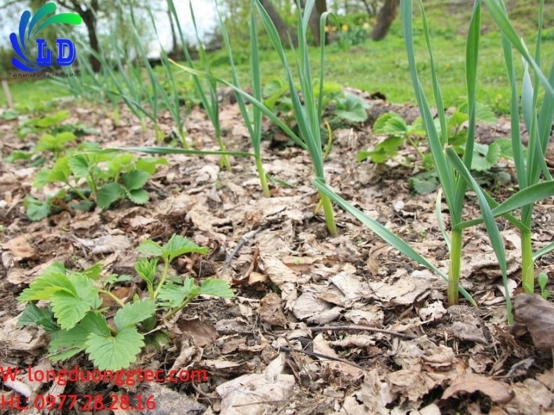 Giường rau với dâu tây và tỏi phủ lớp mùn