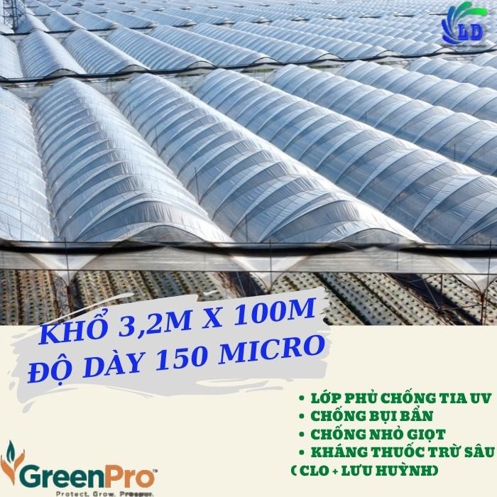 Màng nhà kính GreenPro có các khổ màng với kích thước đa dạng từ 2,2m đến 12m phù hợp với nhiều kích thước nhà màng khác nhau. Độ dày của màng là 150Mic hoặc 200Mic phù hợp với từng nhu cầu và mục đích sử dụng. Với những ưu điểm như chống tia UV, chống bụi bẩn, chống nhỏ giọt, khả năng kháng khuẩn, độ bền cơ học cao, màng GreenPro có thể coi là màng nhà kính tốt nhất trên thị trường Việt Nam hiện nay.