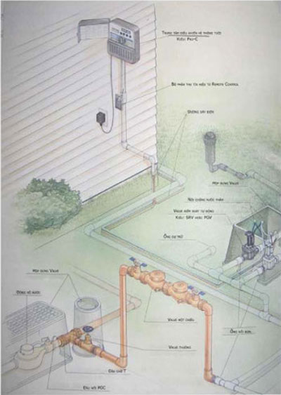 - Mỗi Khu vực trên bản vẽ đều có valve. Valve kiểm soát việc tắt mở dòng nước chẩy tới các bình tưới của khu vực. Biểu thị valve cho mỗi khu vực và một nhóm valves trong một dây chuyền gọi là valve cấp.